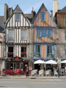 Next stop was Vannes, now in Brittany proper. Vannes is one of the most attractive medieval towns we’ve explored so far (amongst many), set at the head of a huge bay, which is virtually an enclosed sea, and filled with hundreds of islands, many inhabited but only accessible by boat. The old town is surrounded by high walls, and has many narrow, cobbled streets and lanes with timber frame buildings leaning in all directions. We had a very pleasant lunch in a bistro on the ramparts, overlooking the chateau gardens (which can be seen in the photo with a green awning and umbrellas).